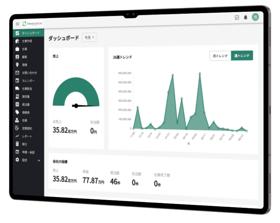 ミツモアのサービスの経験から生まれた業務生産性向上の為のサービス、それがプロワンです。エアコン、電気工事などの短期工事系の事業者様の業務を現場〜バックオフィスまですべてカバーする 業務管理のクラウドサービスです。ミツモアをお使いの事業者様でなくてもご利用可能です。